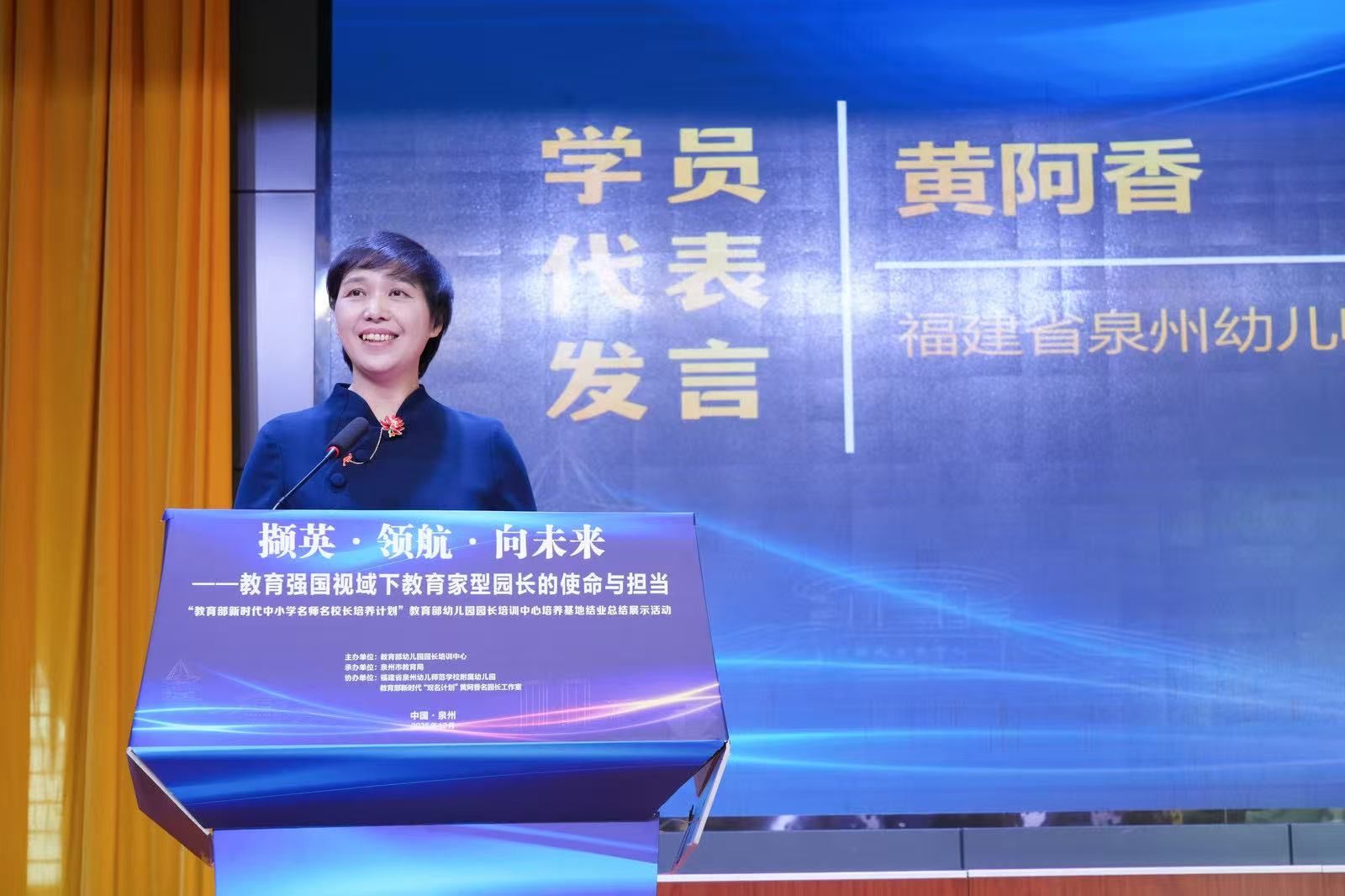 学员代表、泉州幼儿师范学校附属幼儿园黄阿香园长分享学习感悟,感谢园长中心的系统培养和专家导师的悉心指导,未来将继续以教育家精神为引领,以中国式园长领导力为教育强国建设贡献力量。